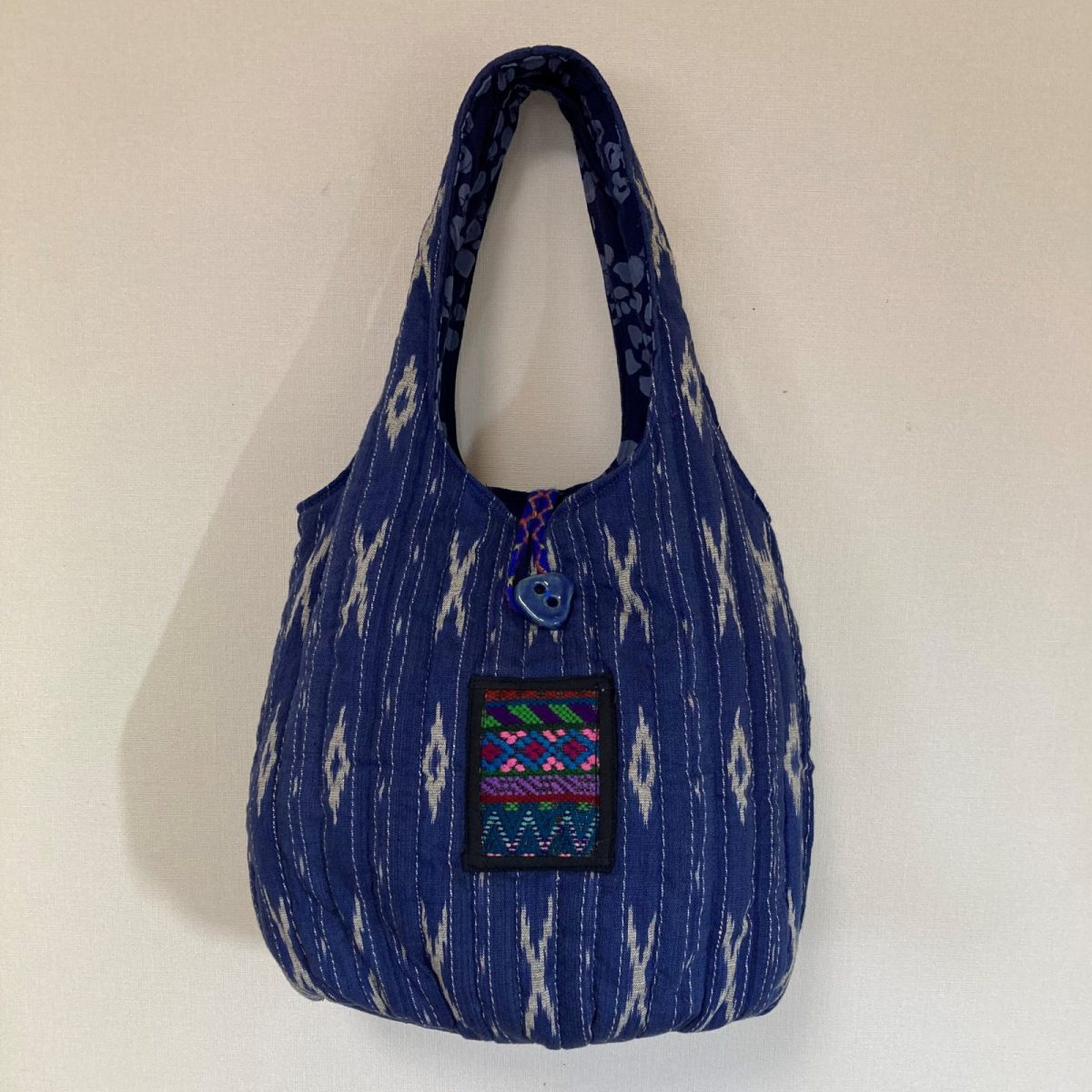 カテゴリー エスニック布バッグ 在庫あり 店頭販売のみ 藍色タイ絣綿、ふっくらバッグ 投稿者 作成者: ekekokao 投稿日 2024年11月16日 藍色のタイの伝統的絣綿を使った、ふっくらバッグです。厚めのキルト芯を貼り、ふんわり感を出しました。ショルダーバックにもなります。反対側はタイの藍染手織り綿を使い、絣布で大き目のポケットを付け(マジックテープ付)裏地は表地に合わせた色合いの柄のコットンを使用しポケットを付けました。フロントにはアクセントとして、大きめのボタンを付けワンポイントにしました。 品名藍色タイ絣綿、ふっくらバッグ材質タイコットン、日本コットン価格円(税込)備考こちらの商品は店頭販売のみとなっております。 ← タイ絣厚地綿ショルダーバック → 茶系グアテマラ絣綿フード付きベスト