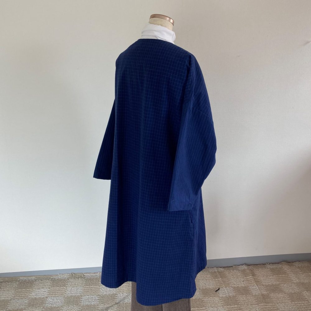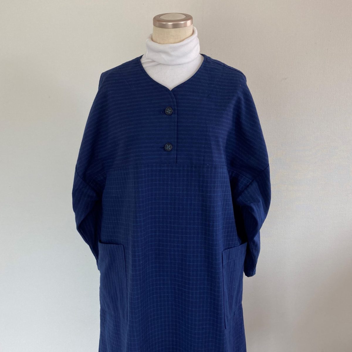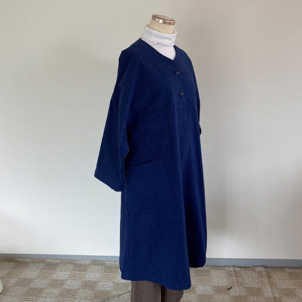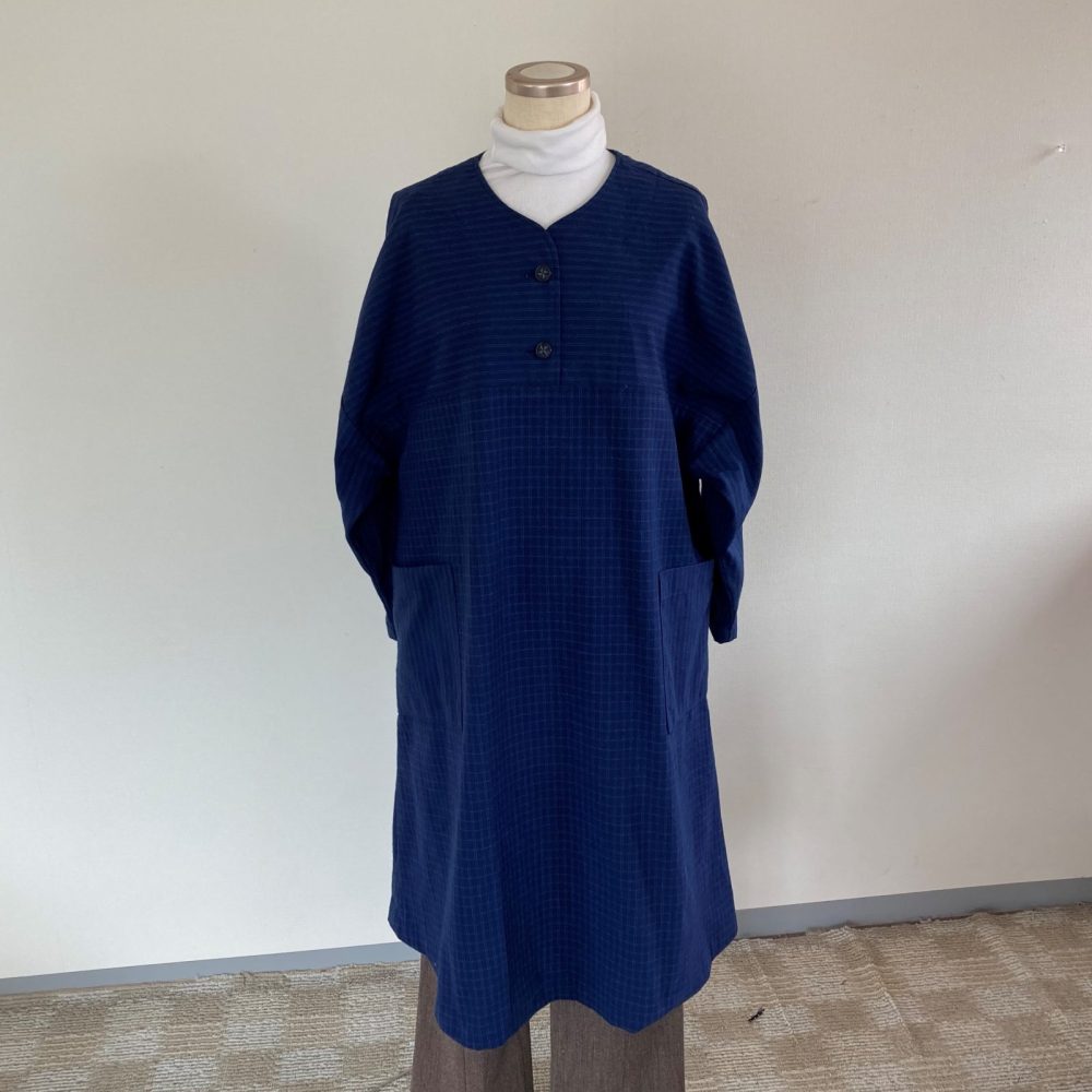 藍色の厚手綿、格子柄と縞柄の布を使い、2つボタンの肩下がりロングワンピースを作りました。前身ごろ両サイドに大き目のポケットを付け、アクセントにしました。これらの写真はLサイズのボディに本品を着せた様子を写したものです