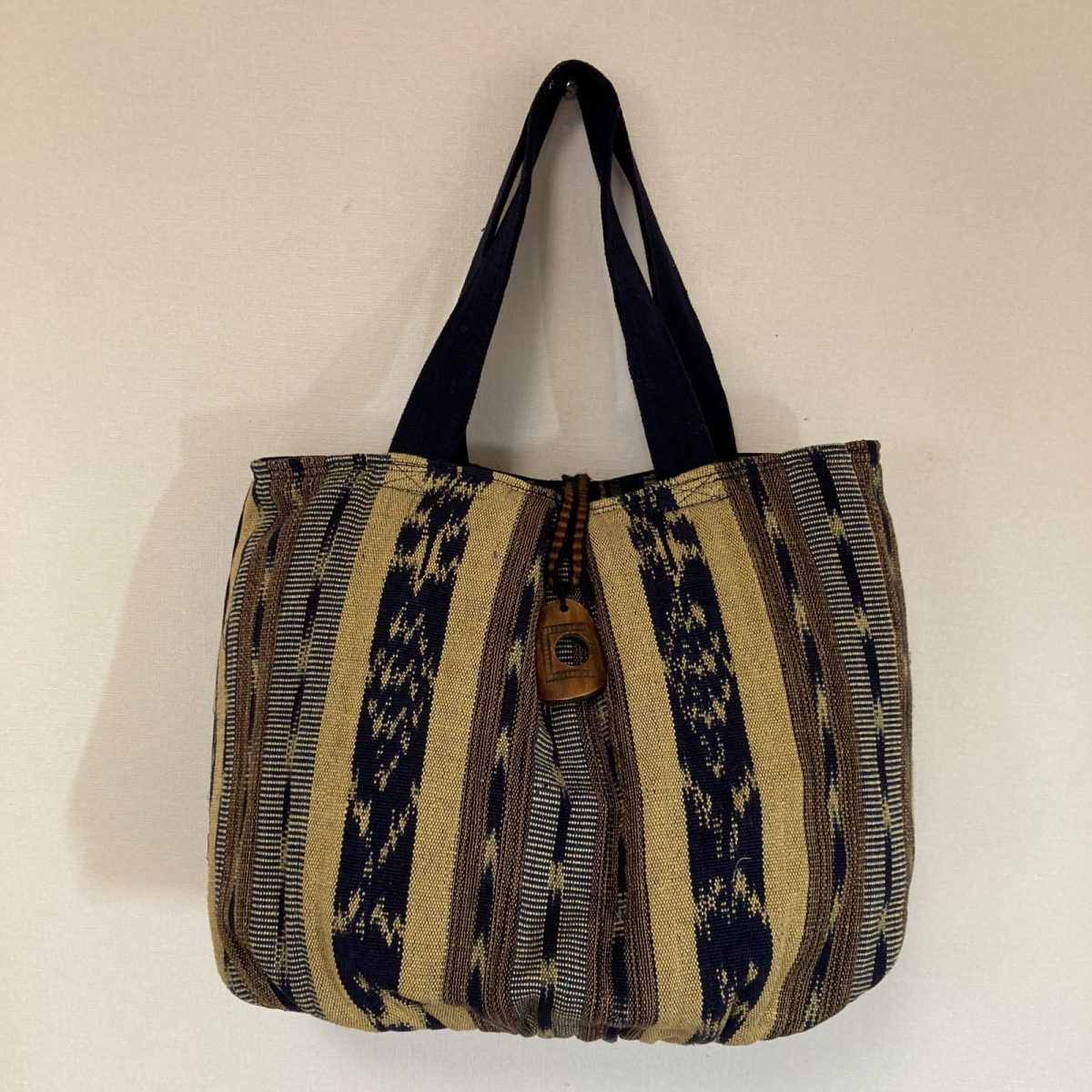 藍色のグアテマラ伝統的絣綿を使ったふっくらバッグです。キルト芯を貼りふんわり感を出しました。反対側はタイの藍色手織り綿を使い、グアテマラ絣綿で大き目のポケットを付け(マジックテープ付き)裏地は表地に合わせた色合いの柄のコットンを使用し、ぽけっとを付けました。フロントにはアクセントとして、陶製ボタンをワンポイントにしました。