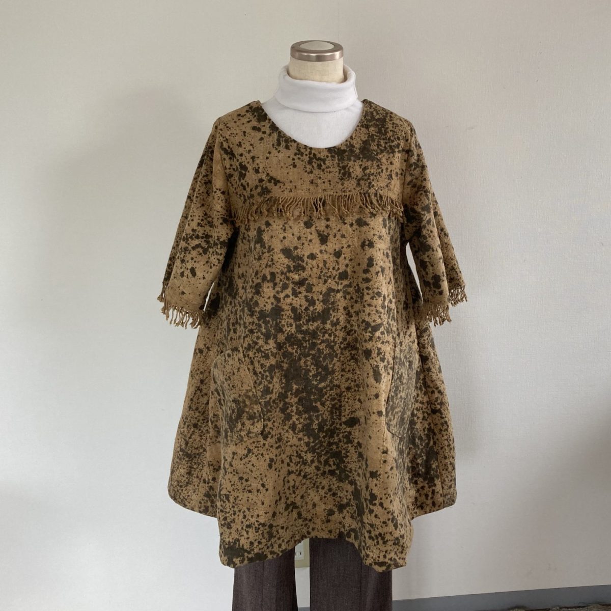 西アフリカ、マリ共和国の伝統手織り布を使って、丸首六分袖チュニックを作りました。幅10cmのテープ状の厚手手織り布を手でかがって布にしてから、鉄分を含む泥を使って、飛沫柄に泥染めした布です。前後身頃のヨークと袖口にはフリンジをつけました。Aラインを強調してすそ幅を広くゆったりとアーム幅もたっぷりと取りました。両サイドにアクセントとしてポケットを付けました。洗濯は手洗いで、色落ちする場合があります。