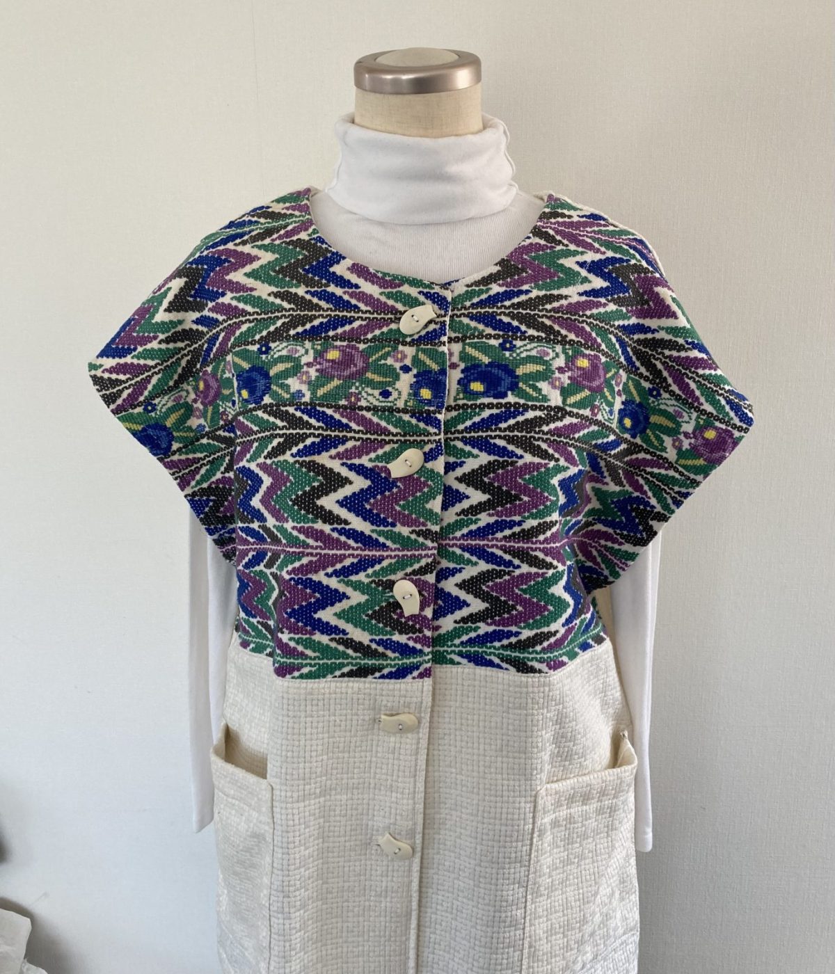 白地に薄紫色の織られている、グアテマラの民族衣装ウィピルを使って、肩下がりのベストを作りました。